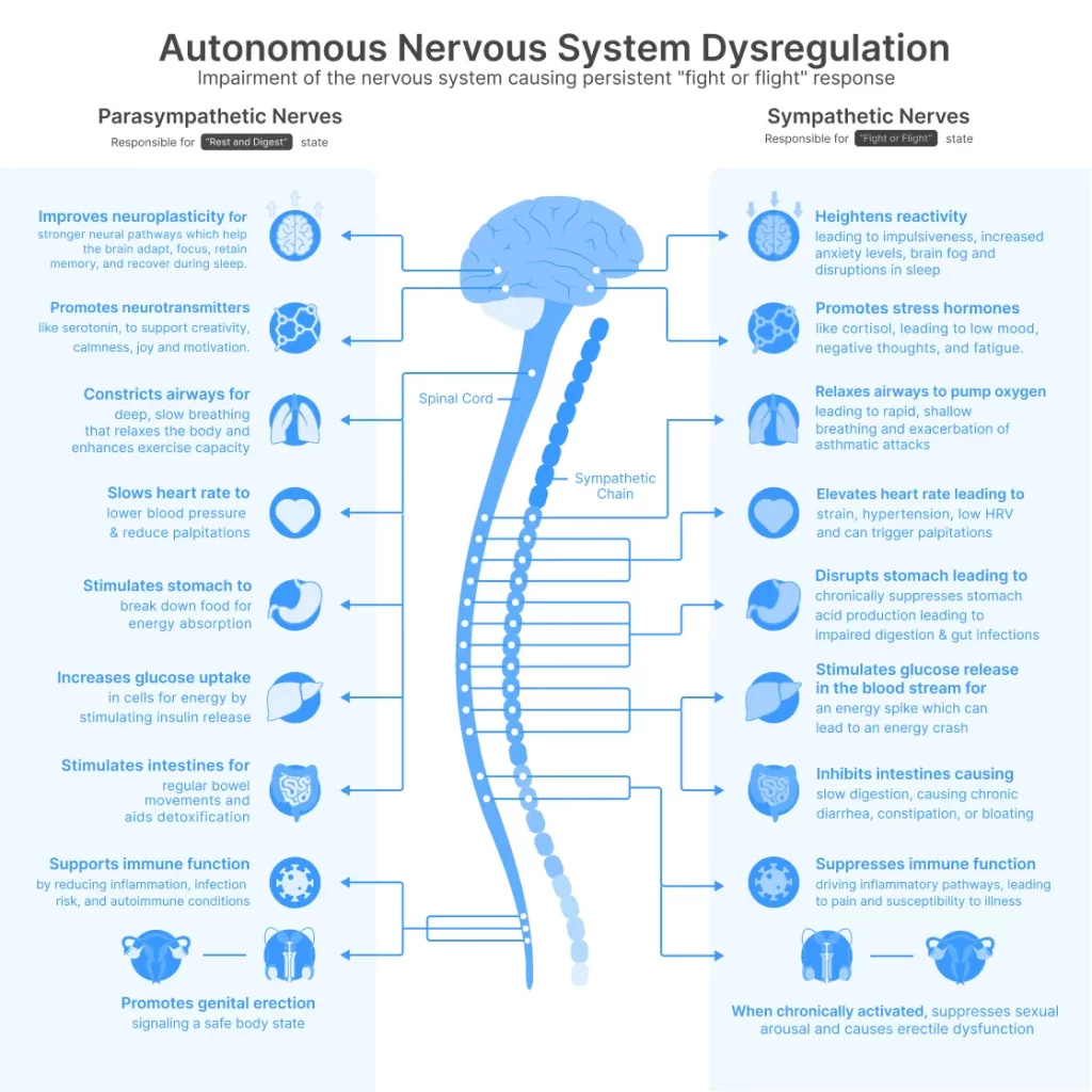 In an ideal system, you move smoothly between the two. But stress — physical, mental, emotional — can tip the balance toward constant sympathetic activation.